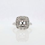 18KW Cushion shaped halo semi-mount prong set with round brilliant cut diamonds and diamonds down shank. 0.93R 24D Head7.5mm S6.5 LQ19692L/PDR-4411